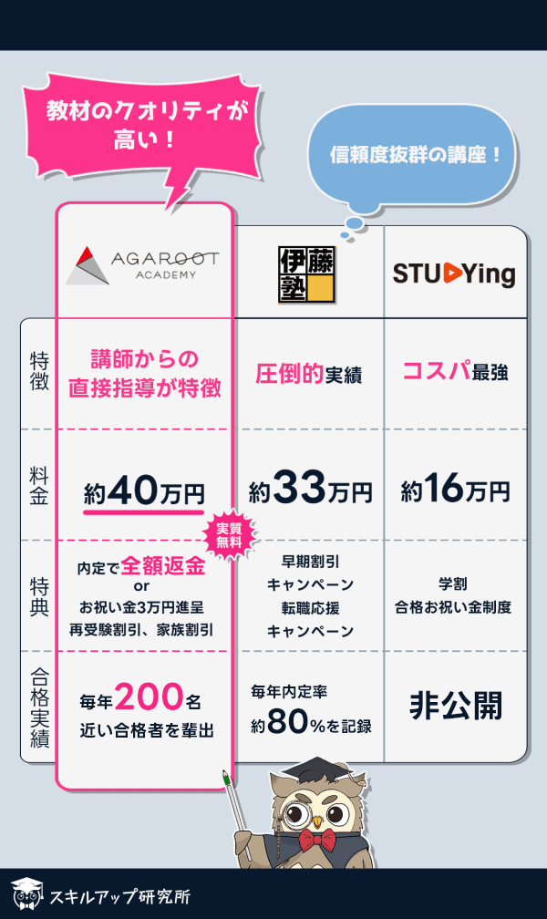 そのため、費用を抑えたい方は、10万円台で筆記から面接まで対応するスタディングがコスパに優れています。