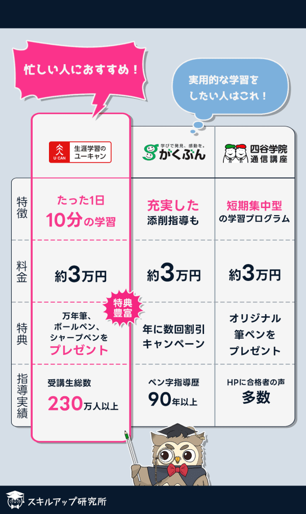特にユーキャンのボールペン字講座がおすすめで、段階的な学習設計と明確な指導により、効率的に学習を進められます。