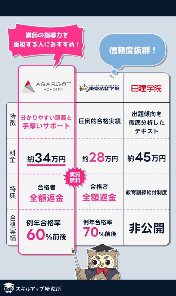 アガルートは講師の指導力の高さと非常に親身なサポート体制が大きな強みとなっています。