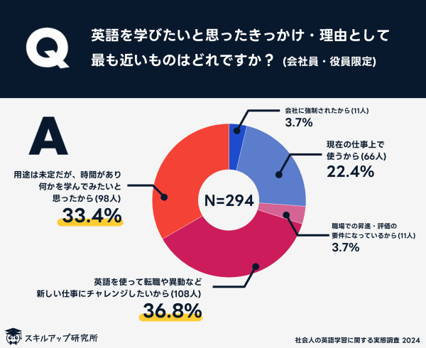 「英語を学びたいと思ったきっかけ・理由として最も近いものはどれですか?」という問に対しては、「英語を使って転職や異動など新しい仕事にチャレンジしたいから」「用途は未定だが、時間があり何かを学んでみたいと思ったから」という回答が最も多く、それぞれ1/3程度になった。