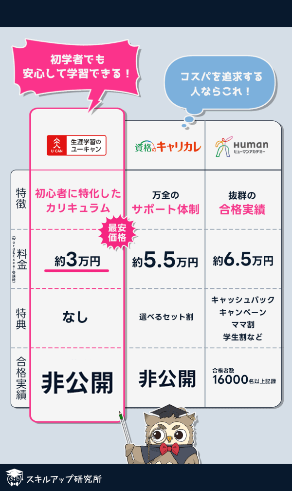 ユーキャンは初心者に特化したカリキュラムを提供しており、そのわかりやすさは受講生に非常に好評です。また、受講料は業界最安値となっており、あまり費用をかけたくない方にもおすすめです。