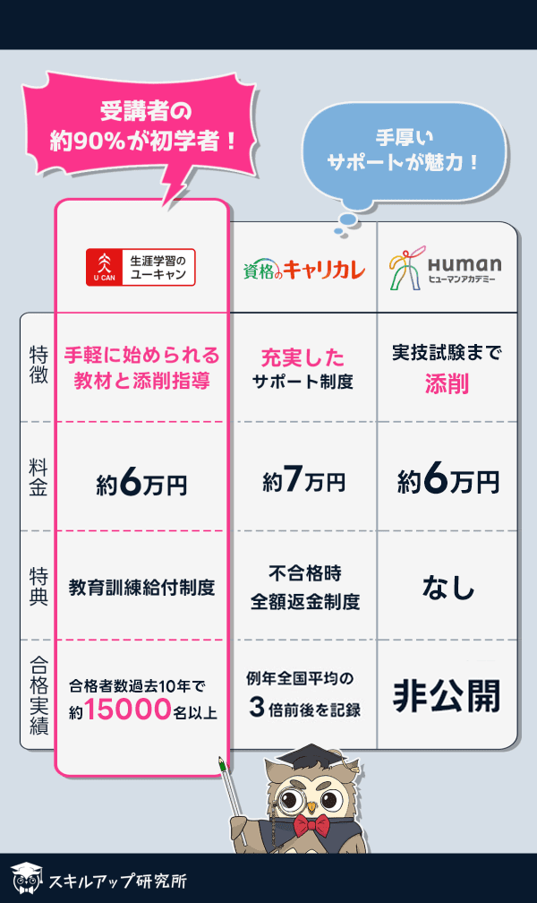 初心者の学びやすさで比較した場合、ユーキャンの講座がおすすめです。