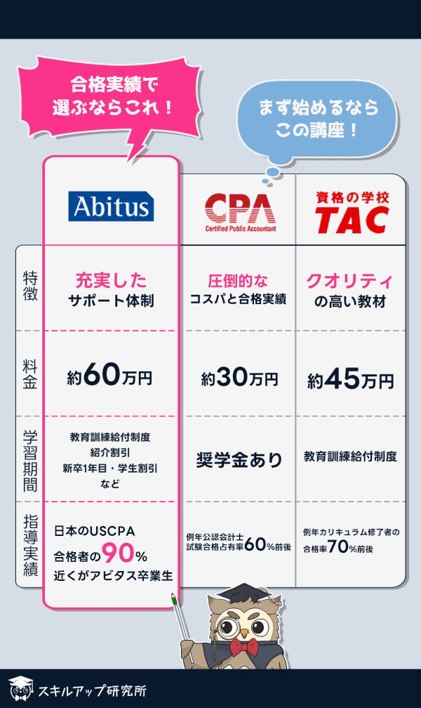 今回、5社のUSCPA予備校を比較検証した結果、最もおすすめの予備校は「Abitus」でした。