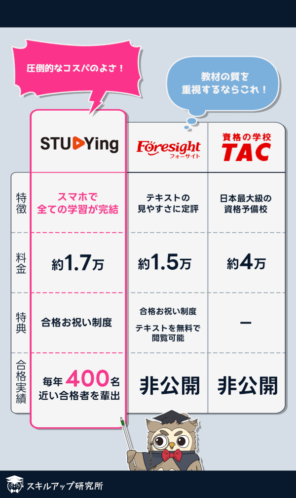 なお、「高品質な講座を受けたい」という方は「フォーサイト」の講座を選ぶのも良いでしょう。フォーサイトは教材をオリジナルで作成しており、その分かりやすさは受講生に非常に好評です。
