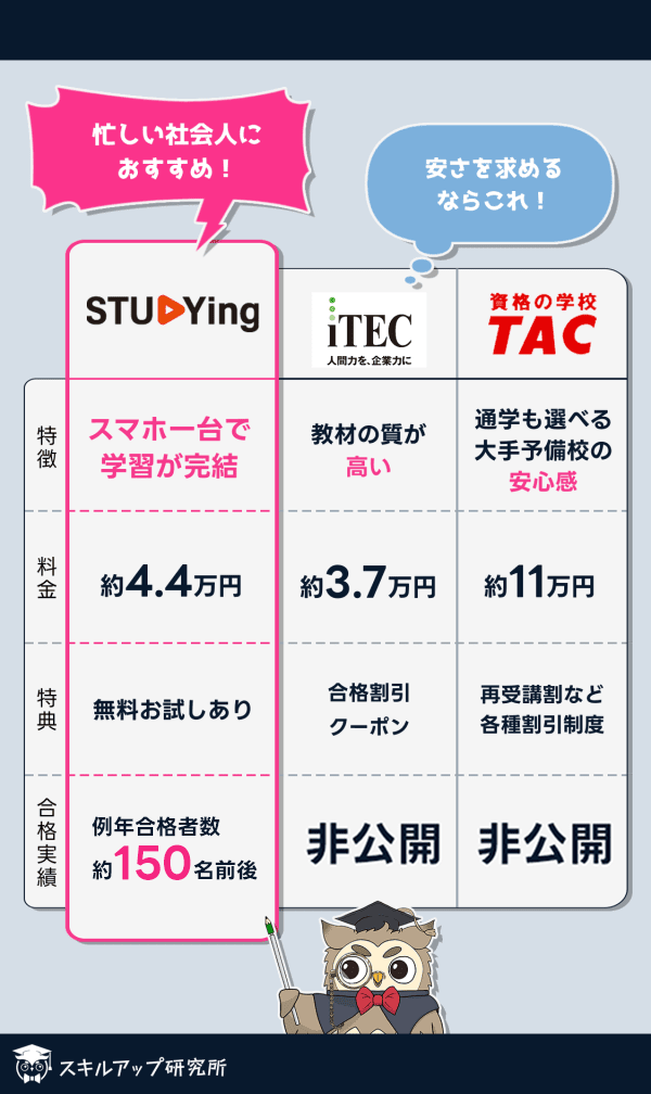 総合スコアではスタディングが最も優れていますが、受講料の安さならITEC、サポート体制ならTACが高評価を得ているなど、項目別で評価が変わっています。