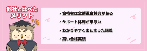 特に、合格特典が豪華なことと、オンライン質問サービスを通じて柔軟に質問できることが大きな利点です。