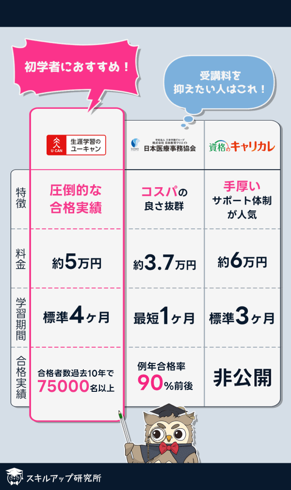 また、ユーキャンや日本医療事務協会も初心者に配慮したテキストを使っているほか、質問対応の素早さや丁寧さが非常に優れており、初心者でも学習が進めやすい環境が整っています。