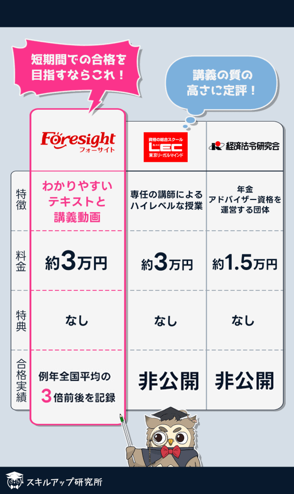 今回、5社の年金アドバイザー対策講座を比較検証した結果、最もおすすめの講座は「フォーサイト」です。