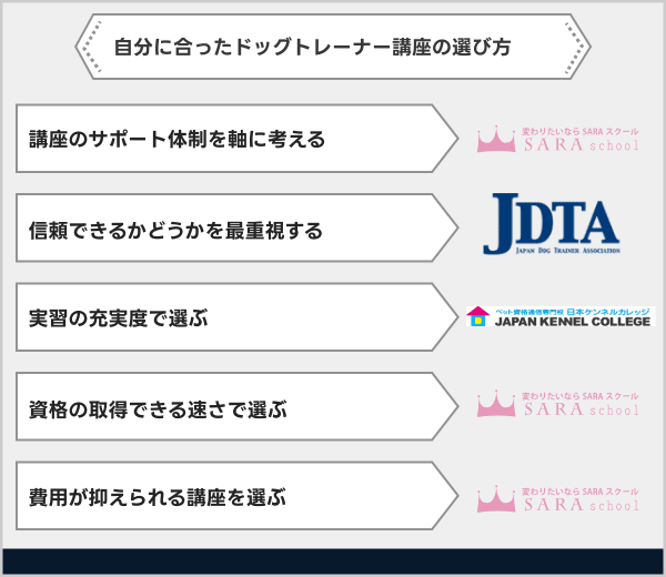 その場合には、受講中のサポートを重要視するのであればSARAスクールが、卒業後のサポートを重要視するのであればPLAYBOW Dog Trainers Academyがおすすめできます。