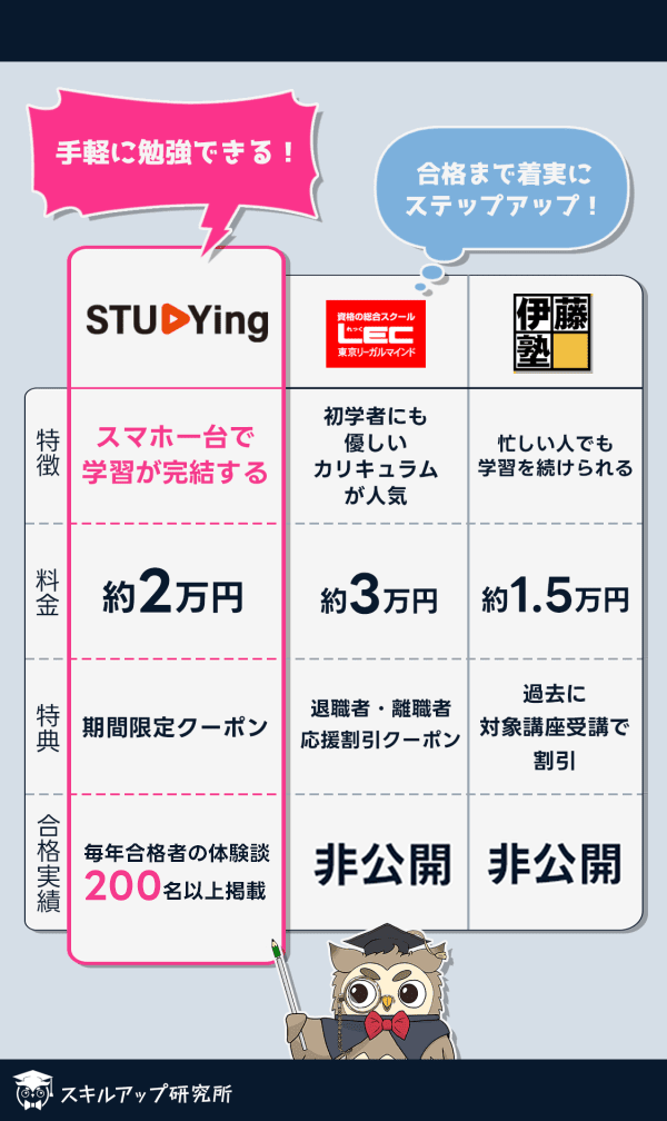 コスパの良さで選ぶのであれば、スタディングかオンスク.JPがおすすめできるでしょう。