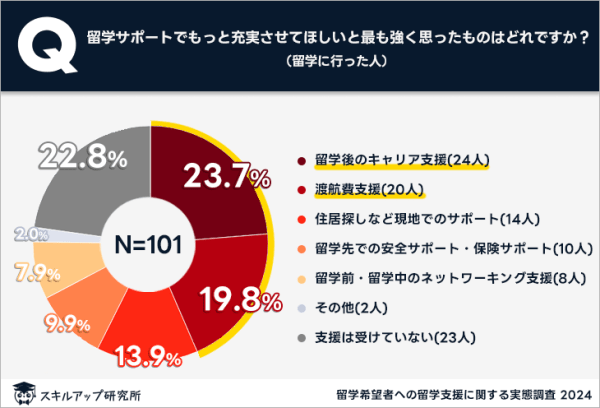 留学に行った人を対象として、留学時のサポートで最も充実させてほしいものを尋ねたところ、23%が「留学後のキャリア支援」と回答し最多となった。