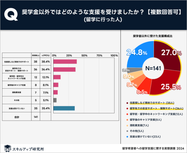「留学の際に最も助かったサポートを教えてください」という質問に対しても27%が「住居探しなど現地でのサポート」、23%が「留学先での安全サポート・保険サポート」と回答しており、これらは満足度も高い優れた支援だと言える。