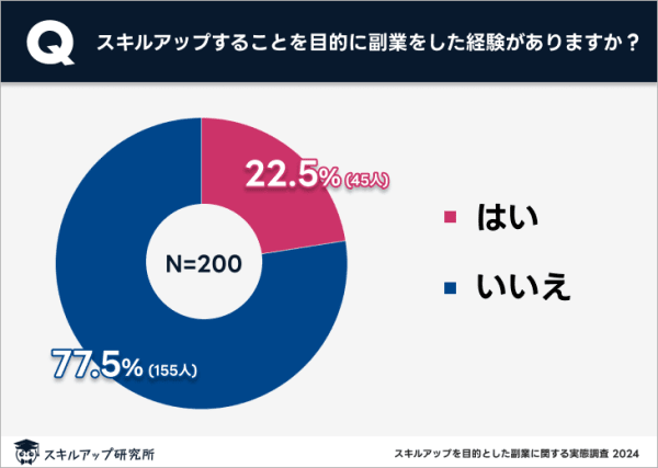 副業経験がある200人を対象に「スキルアップすることを目的に副業をした経験がありますか?」という質問を行うと、「はい」と回答した人は22.5%であった。