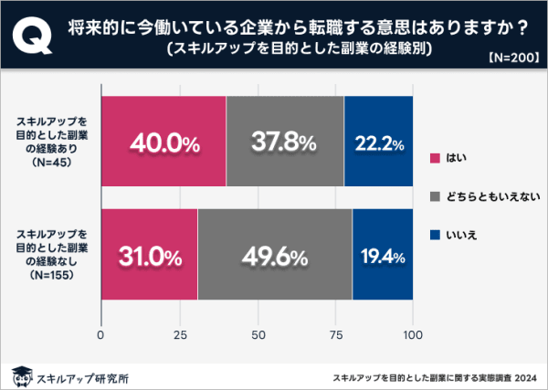 「将来的に今働いている企業から転職する意思はありますか?」という質問を行うと、スキルアップを目的とした副業の経験がある人の方が、経験がない人よりも「ある」と回答した割合がやや多かった。