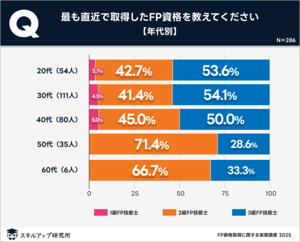 一方で50代以上になると、この比率が大きく変化し、2級取得者が70%前後と優勢になる傾向が見られる。これは、キャリアの進展に伴うスキルアップの結果を反映していると考えられる。