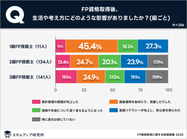 特に「家計管理の意識が向上した」「資産運用を始めたり、見直したりした」「保険や年金について深く考えるようになった」といった項目では、3級・2級・1級の間で大きな差はなく、いずれの級でも生活へのポジティブな影響が確認できる。