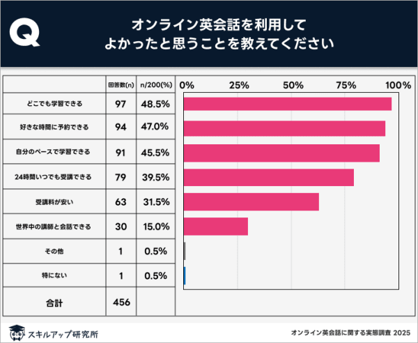 「オンライン英会話を利用してよかったと思うことを教えてください。」という質問を行うと、「24時間いつでも受講できる」、「どこでも学習できる」、「好きな時間に予約できる」「自分のペースで学習できる」という回答が、それぞれ約4割の利用者から得られた。