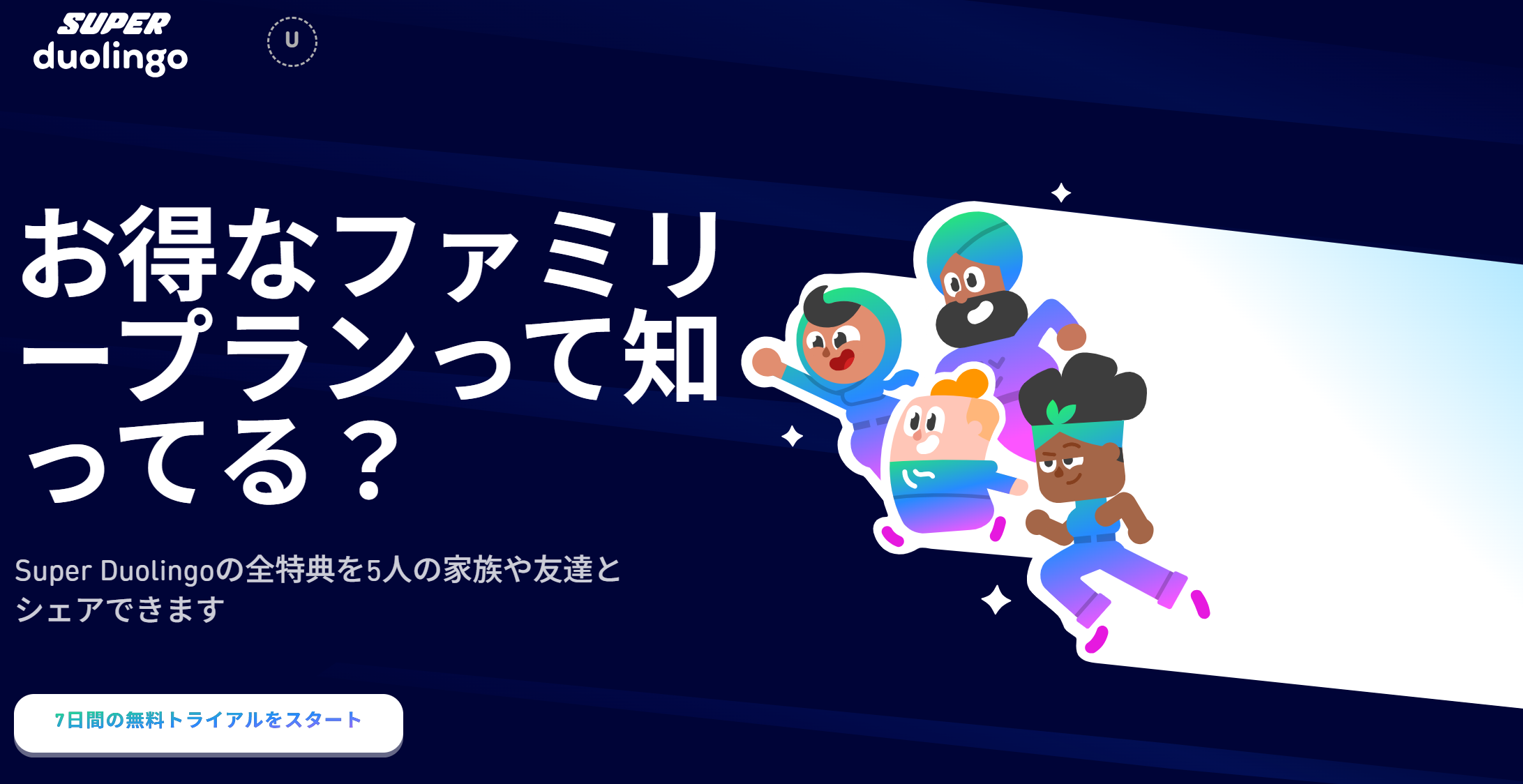 Super Duolingo | ・個人プラン 1,990円 ・ファミリープラン なし | ・個人プラン 9,900円(1ヶ月あたり825円) ・ファミリープラン 13,200円(1ヶ月あたり1,100円) |