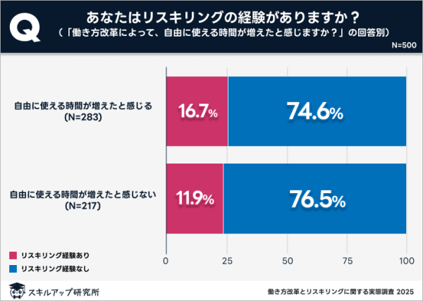 働き方改革によって自由に使える時間が増えたと感じる人と感じない人それぞれに「リスキリングの経験」の有無について尋ねたところ、どちらもリスキリング経験者の割合は10%台にとどまり、その差は5%程度であった。