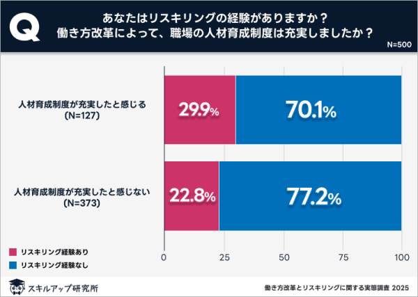 働き方改革によって職場の人材育成制度が充実したと感じる方、感じない方それぞれにリスキリング経験の有無を尋ねたところ、人材育成制度が充実したと感じる方は29.9%が「経験あり」、人材育成制度が充実したと感じない方は22.8%が「経験あり」と回答した。