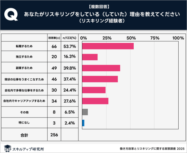 リスキリング経験者に対して「あなたがリスキリングをしている(していた)理由を教えてください。」という質問を行うと、「転職するため」という回答が53.7%で最も多かった。