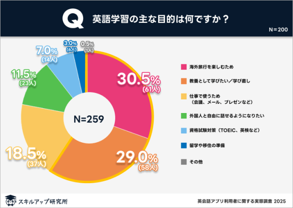 「海外旅行を楽しむため」が30.5%で最も多く、「教養として学びたい/学び直し」が29%でこれに続いており、両者を合わせると全体の約6割を占めている。