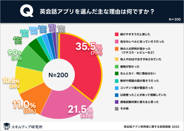 「続けやすそうだと感じた」という回答が35.5%で最も多く、3人に1人以上がアプリの継続性を重視していることが明らかになった。
