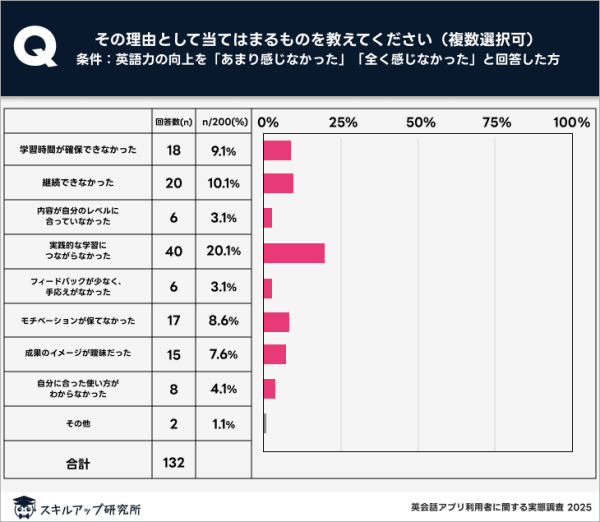英語力の向上を「あまり感じなかった」「まったく感じなかった」と回答した人にその理由を尋ねたところ、最も多かったのは「実践的な学習につながらなかった」だった。