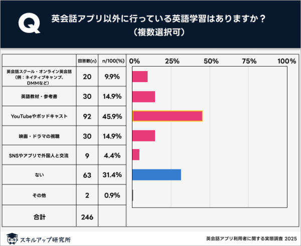 「アプリ以外には何もやっていない」と答えた人は63人(31.4%)であり、3人に1人はアプリのみで学習を行っている。
