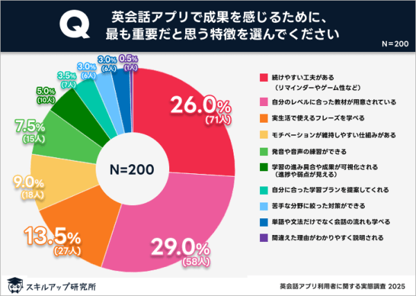 「自分のレベルに合った教材が用意されている」と「続けやすい工夫がある(リマインダーやゲーム性など)」が、英会話アプリで成果を感じるために最も重要だとされた特徴の上位を占めた。