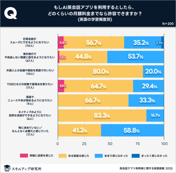 「会議・商談」「ネイティブのような会話」など、難易度の高い目標を持つ人は成果を感じやすいことが数値としても明らかになった。