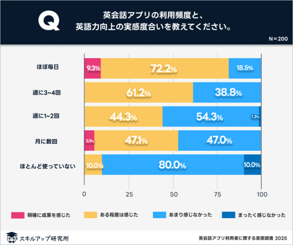 学習目的が具体的で、自分の言語スキル向上に対する期待やゴールが明確な利用者は、アプリを戦略的に活用できており、一定の成果実感を得ていることがわかる。