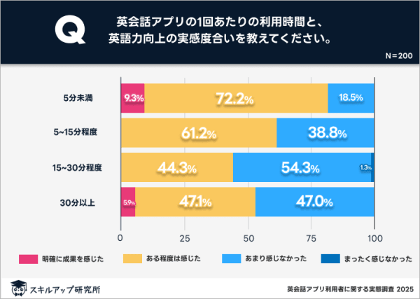 「15〜30分程度」学習している人のうち、7割以上の人が成果を感じていると分かった。