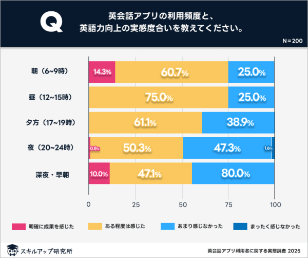 朝(6〜9時)と昼(12〜15時)に学習した人の75%が何らかの成果を感じている。