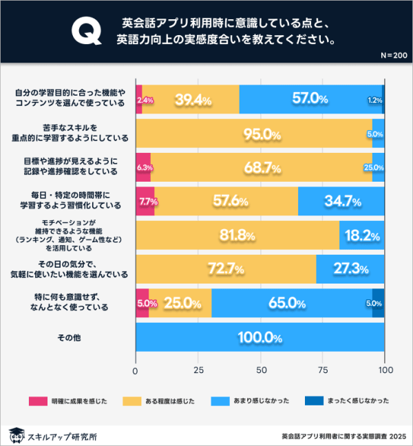 「苦手なスキルを重点的に学習している」と回答した人のうち、95%が何らかの成果を感じている。