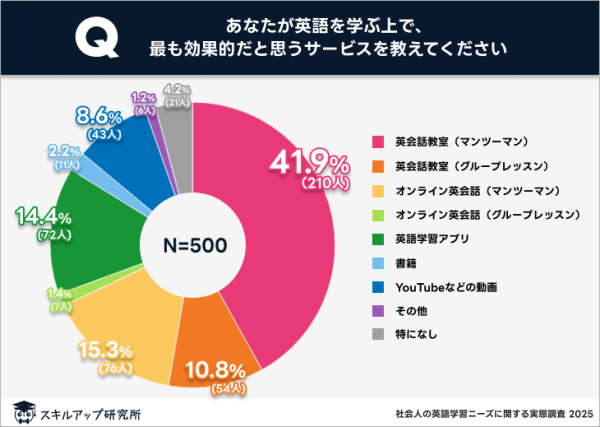 英語学習において最も効果的だと考えられているサービスは、「英会話教室(マンツーマン)」で41.9%、次いで「オンライン英会話(マンツーマン)」が15.3%だった。
