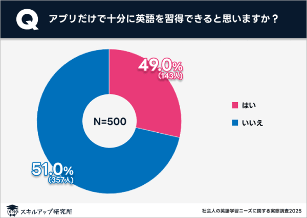 英語学習アプリは実際に多く利用されているが、あくまで補助的なツールとして認識されており、それ単体での完全な習得は難しいと考えている人が多数派であるようだ。