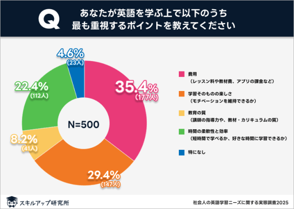 英語を学ぶ上で最も重視するポイントについて尋ねると、「費用」が35.4%で最も多かった。この結果から、費用を抑えられる格安のオンライン英会話や英会話アプリといったサービスが今後も支持されると考えられる。