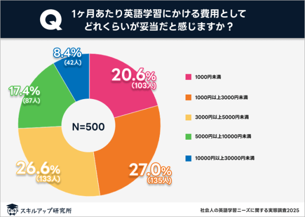 「1ヶ月あたり英語学習にかける費用としてどれくらいが妥当だと感じますか?」という質問を行うと、「1000円以上3000円未満」が27%で最も多く、次いで「3000円以上5000円未満」が26.6%だった。
