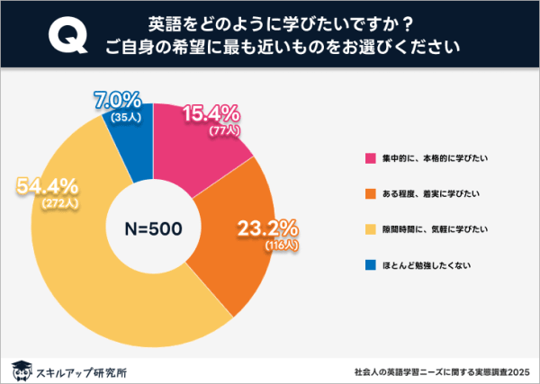 「英語をどのように学びたいですか?」という質問を行うと、「隙間時間に、気軽に学びたい」と回答した人が54.4%と半数以上を占め、最も多かった。