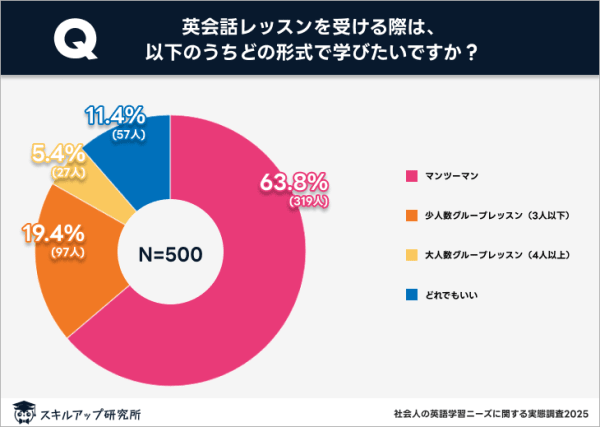英会話レッスンの形式について尋ねたところ、「マンツーマン」が63.8%と圧倒的な人気を集めた。次いで「少人数グループレッスン(3人以下)」が19.4%となり、少人数または個別指導への強いニーズが判明した。