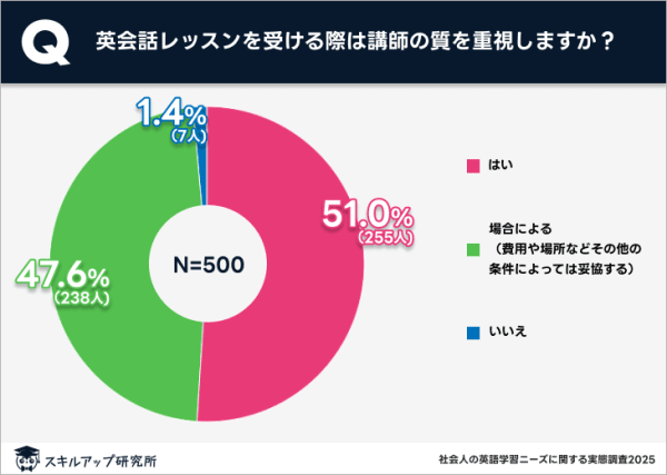 「英会話レッスンを受ける際は講師の質を重視しますか?」という質問を行なうと、「はい」と回答した人が51%と半数を占めた。