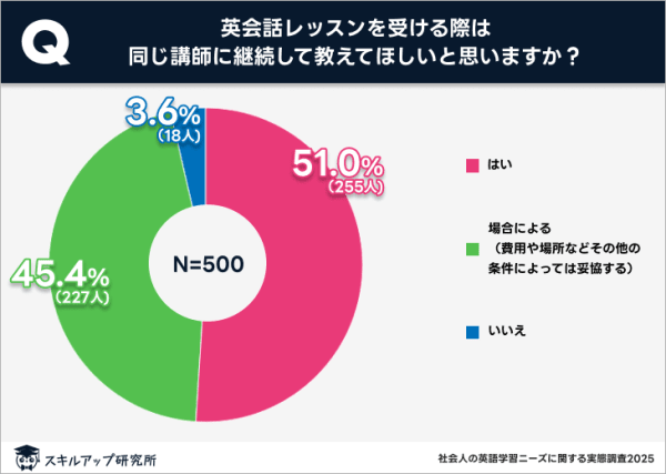 「英会話レッスンを受ける際は同じ講師に継続して教えてほしいと思いますか?」という質問を行うと、「はい」と回答した人が51%と半数を占めた。