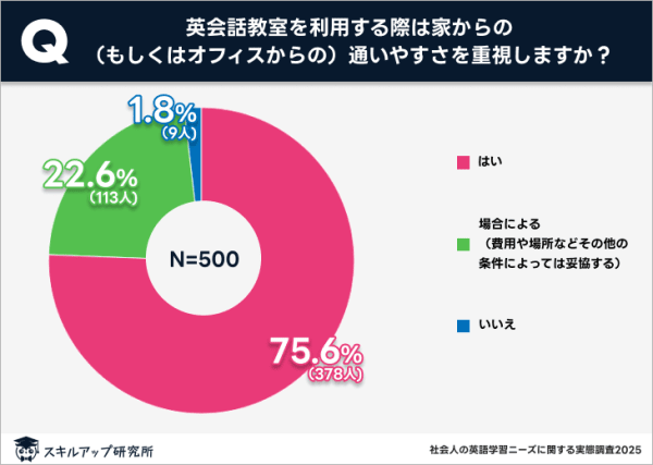 「英会話教室を利用する際は家からの(もしくはオフィスからの)通いやすさを重視しますか?」という質問に対して、「はい」と回答した人が75.6%と非常に多かった。