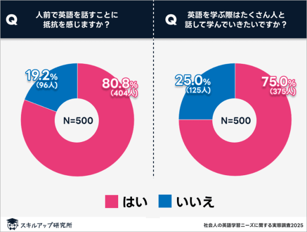 「人前で英語を話すことに抵抗を感じますか?」という質問に対し、80.8%が「はい」と回答しており、多くの人が英語を話すことに対して心理的なハードルを感じている。