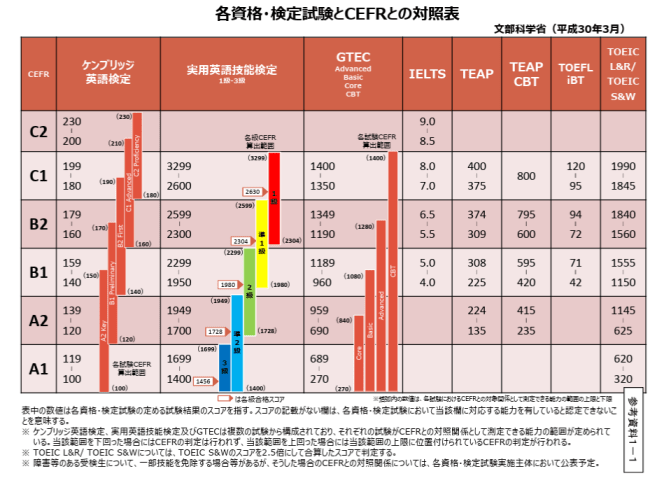 TOEIC、英検、IELTS、TOEFLなどの主要な英語試験は、それぞれCEFRレベルとの対応表を公開しており、自分のスコアからおおよそのCEFRレベルを把握することが可能です。
