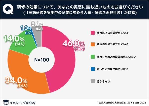 人事・研修企画担当者に効果の実感を尋ねたところ、「期待以上の効果」(46%)と「期待通りの効果」(34%)を合わせ、実に80%が研修の成果を肯定的に評価していた。