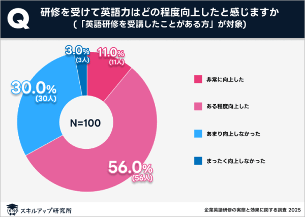 一方、実際に研修を受講した社員では「非常に向上した」がわずか11%にとどまり、「ある程度向上した」が56%と多数派となった。