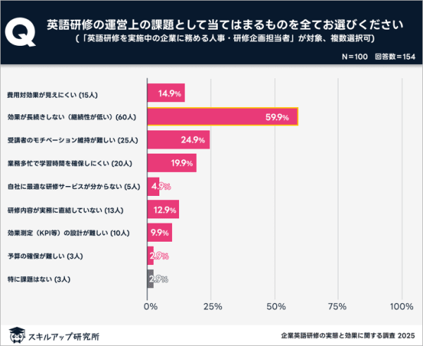 人事・研修企画担当者に研修運営上の課題を聞いたところ、最も多かったのは「効果が長続きしない(60%)」だった。