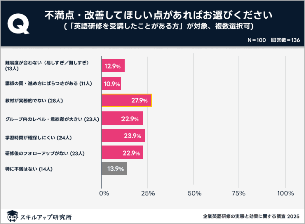 一方、受講者に不満点を尋ねると、「教材が実務的でない」(28%)が最多で、「学習時間の確保が難しい」(24%)、「グループ内のレベル差」(23%)、「フォローアップ不足」(23%)が続いた。